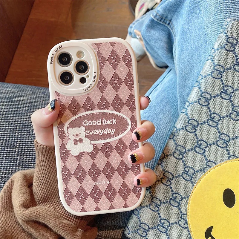 Detail Soft Case Bahan Kulit Motif Kartun Beruang Kotak-Kotak Untuk iPhone 13 13pro 13prm 11 7Plus 8Plus Xr XS 13 12pro MaxTPU