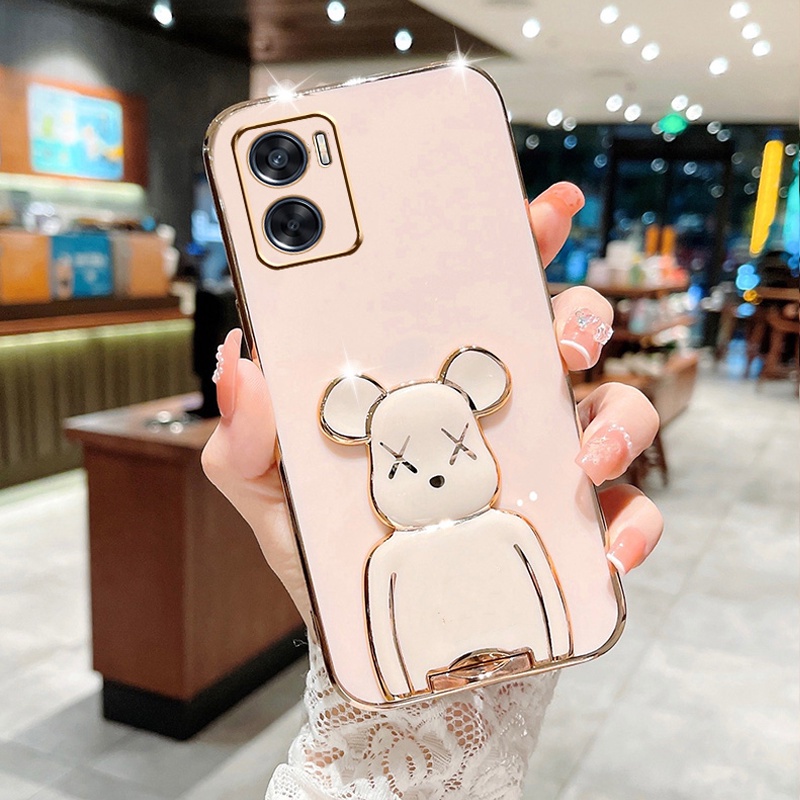 Oppo A96 A76 A55 A3S A12e A31 2020 A52 A92 A5 2020 A9 2020 A83 A1K A93 A94 F11 Reno 5F Reno4F Case Cool Bear Pemegang Dudukan Tak Terlihat Mewah Plating Silicone Soft Cover