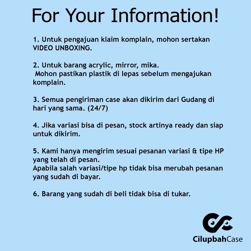 * Semua pengiriman case akan dikirim dari Gudang di hari yang sama. (24/7) * Jika variasi bisa di pesan, stock artinya ready dan siap untuk dikirim. * Kami hanya mengirim sesuai pesanan variasi & tipe HP yang telah di pesan. Apabila salah variasi/tipe hp tidak bisa merubah pesanan yang sudah di bayar. * Barang yang sudah di beli tidak bisa di tukar.