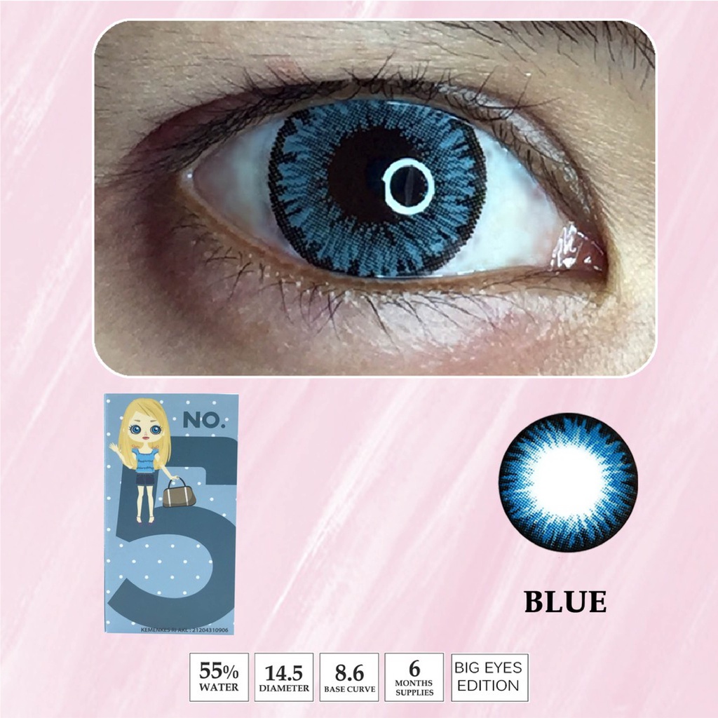 2 tones disposable soft cosmetic lens 6 month supplies (pemakaian 6 bulan) 55% water content, 45% polyhema Base curve : 8.6 mm Diameter : 14.5 mm Color range : blue Power range : ready sesuai variasi No AKL : 21204310910 Made in Korea