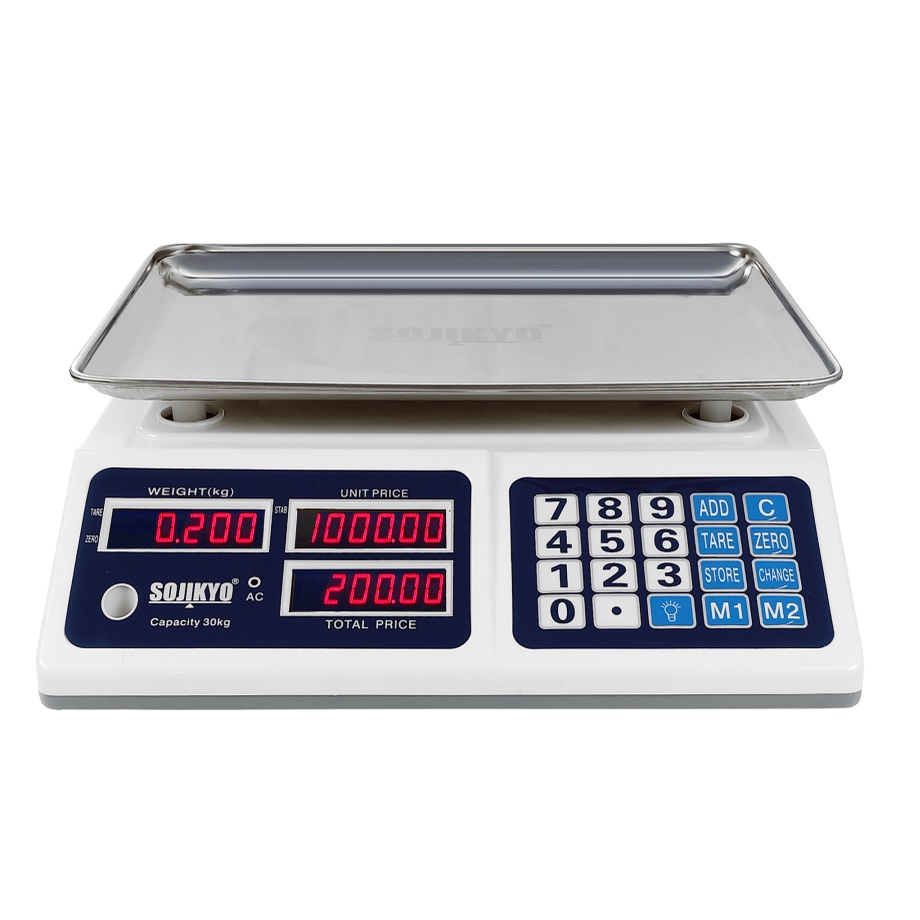 Sojikyo ECO 30ACS Timbangan Duduk Digital 30 Kg / Timbangan Sayur Buah Laundry 30 kg Deskripsi Produk - Tipe : Skala Komputasi Harga Elektronik - Kapasitas / Divisi : 3kg/1g, 6kg/2g, 15kg/5g, 30kg/5g - Papan Ketik : 20 kunci dengan 2 memori harga satuan yang telah ditentukan sebelumnya - Satuan Berat : Kg - Sumber Daya Listrik : AC= 110/220 V (± 10%) atau DC: 4 V/4Ah baterai isi ulang - Piringan Timbang : Stainless Steel / 33,5 x 24,5 CM - Garansi : 6 Bulan Suku Cadang / 12 Bulan Perbaikan Cocok untuk JENIS USAHA : LAUNDRY SHOP | RETAIL SHOP | FRUIT &VEGI SHOP | COURIER SERVICE | SMALL INDUSTRY ACS / TCS Skala Komputasi Harga Elektronik adalah sejenis alat penimbangan multifungsi. Timbangan ini tidak hanya menghitung dengan tepat dan cepat, tetapi juga beroperasi dengan mudah. Timbangan tersebut telah menggunakan mikroprosesor chip tunggal canggih dan load cell presisi tinggi, sehingga stabil dan tahan lama digunakan. Timbangan ini mengadopsi tampilan LED, dan dapat menggunakan daya AC atau DC untuk memiliki fitur tidur otomatis, hemat energi, tampilan tegangan, peringatan bip tegangan rendah, pengisian daya baterai DC secara otomatis, penyimpanan harga satuan, perubahan, dll. Oleh karena itu, itu banyak digunakan dalam bisnis atau industri lain sebagai instrumen penghitungan harga.