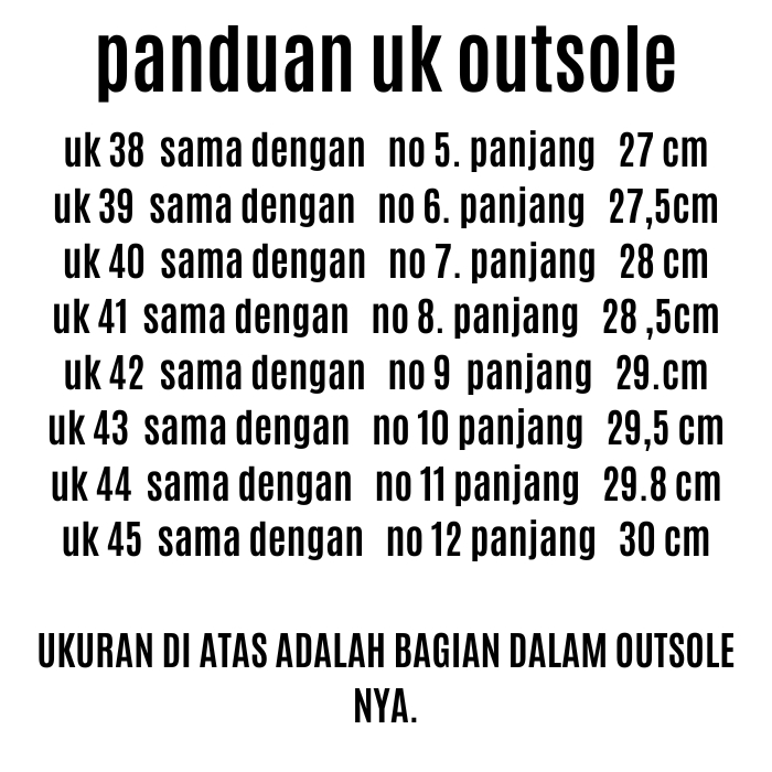ket ; outsole untuk sepatu safety.pdl.hiking.chettah.king. Material : Rubber karet mentah Size : ready 38 39 40 41 42 43 44 45 uk 38 sama dengan no 5. panjang 27 cm uk 39 sama dengan no 6. panjang 27,5cm uk 40 sama dengan no 7. panjang 28 cm uk 41 sama dengan no 8. panjang 28 ,5cm uk 42 sama dengan no 9 panjang 29.cm uk 43 sama dengan no 10 panjang 29,5 cm uk 44 sama dengan no 11 panjang 29.8 cm uk 45 sama dengan no 12 panjang 30 cm