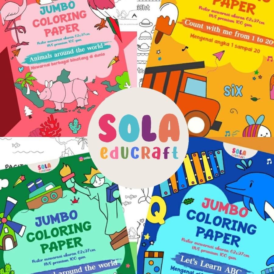Desain eksklusif Sola Educraft Ukuran raksasa 62 x 97 cm Kertas tebal HVS premium 1️⃣0️⃣0️⃣ gsm tebal & kuat Dikirim dalam bentuk lipatan, packing aman menggunakan kardus, bubblewrap, dan plastik Rekomendasi alat gambar: pensil warna✏️, crayon🖍️, dan spidol🖌️