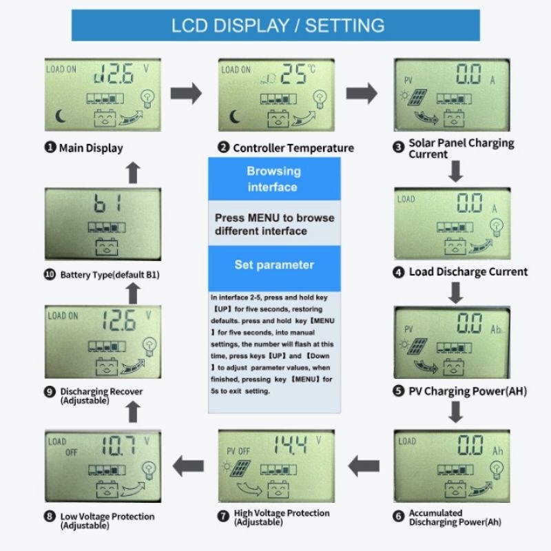 Tak perlu pengaturan yang rumit. Solar charge controller mendukung sistem baterai 12 V atau 24 V dan secara otomatis mengidentifikasi tegangannya setelah terhubung. Alat bahkan dapat digunakan bersama baterai aki (lead-acid), baterai lithium-ion (ternary lithium), atau baterai LFP (lithium iron phosphate).