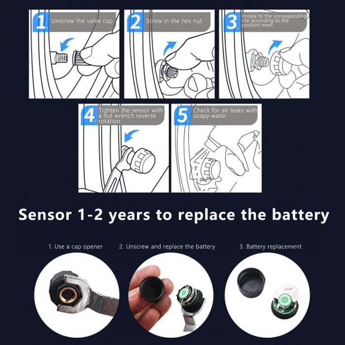 Spesifikasi External Sensor : ♦ Sensor working temperature: -20 ℃ -80 ℃ ♦ Sensor pressure monitoring range: 0-8Bar (116Psi) ♦ Sensor pressure accuracy: ± 0.1Bar (1.5Psi) ♦ Sensor temperature accuracy: ± 3 ℃ ♦ Sensor transmission power: <10dBm ♦ IP : 68 ♦ Battery life time : 3 tahun External Sensor
