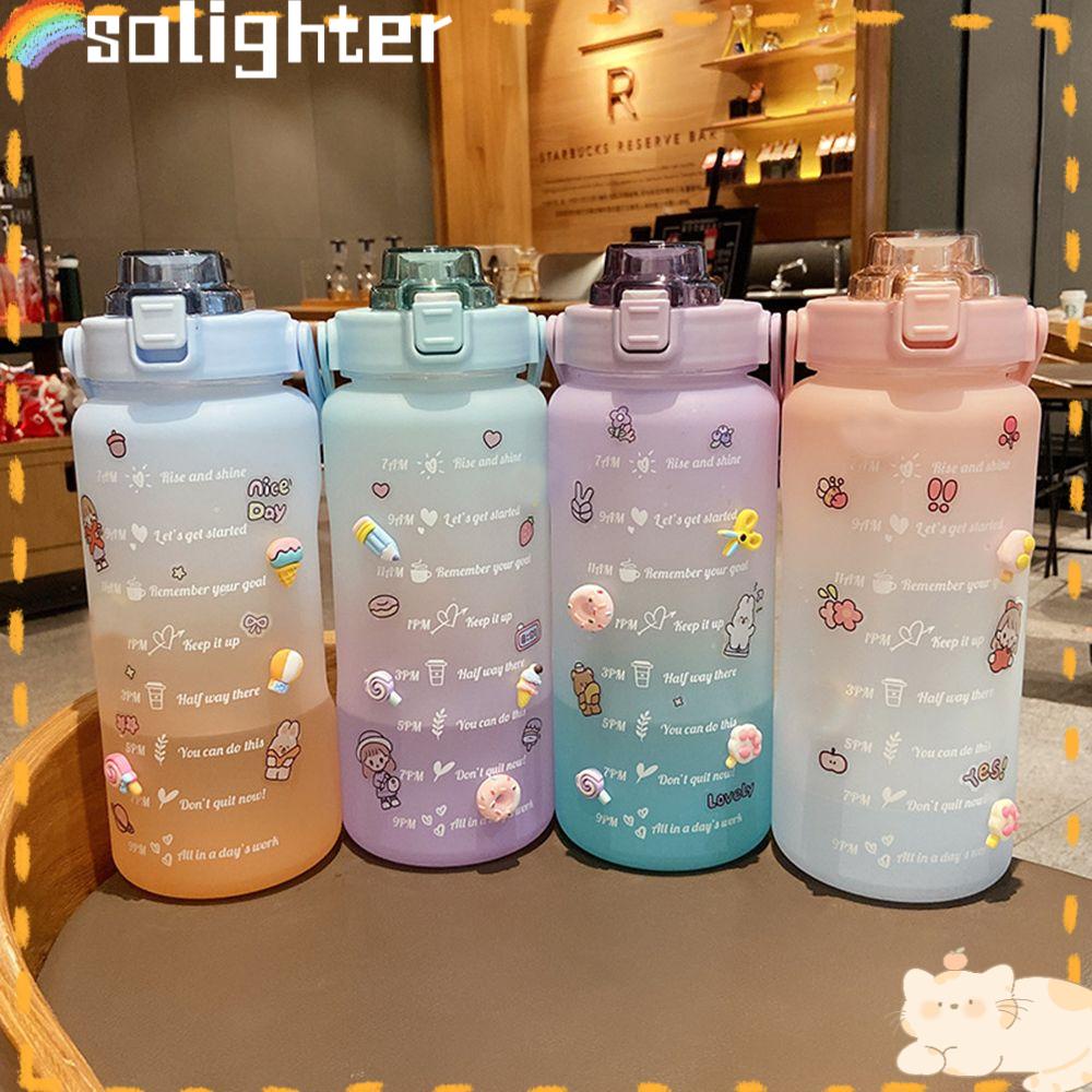 Solighter Botol Air Olahraga 2000ml Perlengkapan Luar Ruangan Stiker 3D Kapasitas Besar Dengan Penanda Waktu Cangkir Sedotan