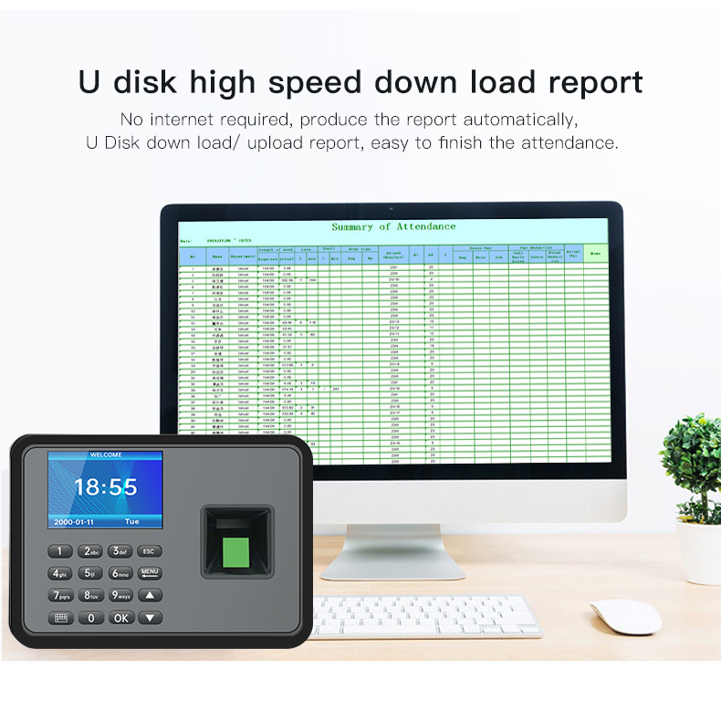 Mesin Absensi Sidik Jari yang dirancang khusus dengan Teknologi SSR Function, yaitu Pengaturan Jadwal Kerja bisa langsung dilakukan di mesin sampai dengan pengolahan data dan Export Laporan Kehadiran. Mesin ini juga sudah dilengkapi dengan Layar TFT LCD Full Color dan USB Cable untuk koneksi ke software serta Port USB Disk untuk penarikan data dengan Flash Disk tentunya. Mesin ini dilengkapi Bracket agar dapat ditempel dinding dengan lebih kuat dan aman.