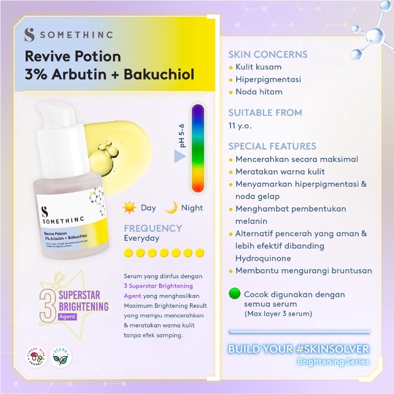 ✨ Revive Potion 3% Arbutin + Bakuchiol | BPOM : NA18210106168 Serum brightening yang dapat mencerahkan wajah, menyamarkah hiperpigmentasi, dan menyamarkan kerutan. Diformulasikan dengan Alpha Arbutin, Bakuchiol, dab sabwhite mambantukulit glowing maksimal.
