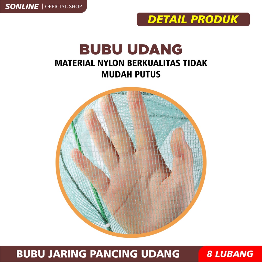 Fitur Dan Keunggulan : - Hexagon Design (agar ikan masuk dari arah manapun) - Fish Net Tarp (cocok untuk menangkap ikan kecil dan sejenisnya) - Foldable (bisa dilipat)