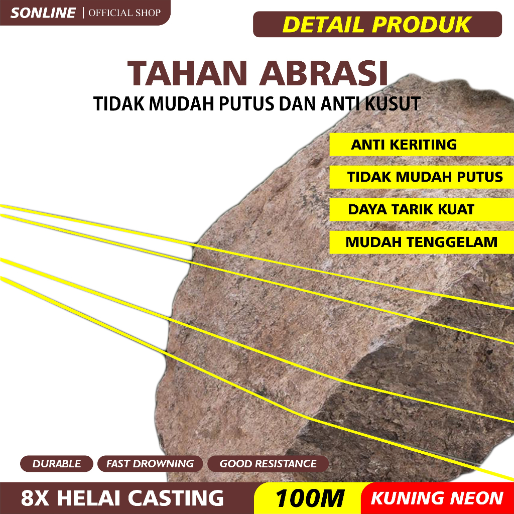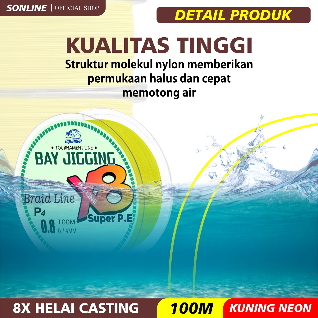 Fitur:: 1.Terbuat dari 8 helai serat PE yang dikepang; ketegangan: Tegangan dan kekuatan adalah 3 - 5 kali lipat dari garis nilon normal pada diameter yang sama. 2.Diameter lebih Tebal, tanpa peregangan, sensitivitas tinggi: diameter lebih tipis berarti lebih banyak garis dapat digulung pada gulungan. Perawatan Membran membuatnya lebih sensitif dan halus untuk casting yang lebih lama. 3.Perawatan membran canggih membuatnya hampir nol penyerapan air dan meningkatkan kehalusan dan kemampuan tenggelam, membuat umpan berenang lebih hidup. 4.Kepadatan tinggi garis kepang membuat garis lebih tipis dan memiliki kinerja yang lebih baik dalam menenggelamkan dan meminimalkan backlashe. 5.Tidak ada memori dan ketahanan abrasi yang sangat baik membuat garis pas untuk lingkungan memancing yang keras dan secara efektif menahan pukulan hambatan di dalam air.