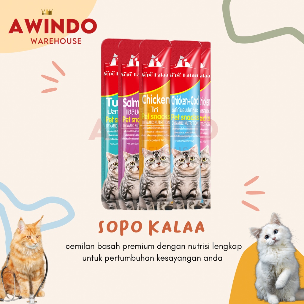 SOPO KALAA Snack merupakan snack yang enak untuk kucing + 100% daging asli, kaya nutrisi, enak dan menarik. + Grain-free, bermanfaat untuk pencernaan, mencegah alergi