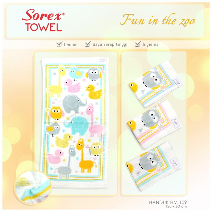 Sorex handuk mandi ini terbuat dari bahan 100 % katun premium yang lembut di kulit, berdaya serap tinggi sehingga cepat kering dan juga higienis jadi aman untuk kulit bayi yang sensitif. Handuk ini tersedia dalam 2 pilihan motif yang lucu dan imut nih, cocok dipakai untuk bayi maupun balita.