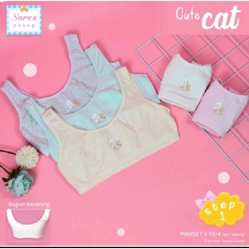 warna y1102 putih 2048 Miniset step 1 Sorex Y 1101 1104 1105 1103 1102 ini diperuntukkan anak perempuan anda yang memasuki tahap awal pertumbuhan payudara. Terbuat dari bahan stretch yang lembut dan dapat menyerap keringat dengan baik. Miniset ini sangat nyaman digunakan serta memiliki karet elastis di bawah dada.
