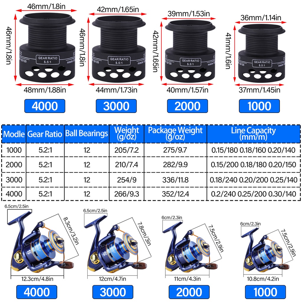 Gulungan Memancing Warna biru Rasio Roda Gigi: 5.2: 1 Bantalan Bola:12 Model:2000/3000/4000 Penggunaan Tangan: Pegangan Inter-changeable Kanan / Kiri