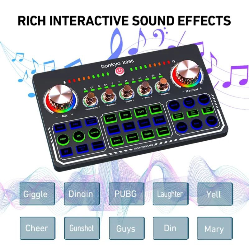 Deskripsi Produk: Sound card ini dirancang khusus untuk mereka yang ingin siaran langsung atau merasakan karaoke di rumah, sehingga Anda dapat merasakan efek studio musik di rumah. Sound card ini juga dilengkapi dengan banyak efek khusus yang dapat membuat suara asli Anda menjadi lebih menarik. Bisa juga digunakan sebagai equalizer untuk mengatur bass, treble dan reverb sesuai keinginan anda.