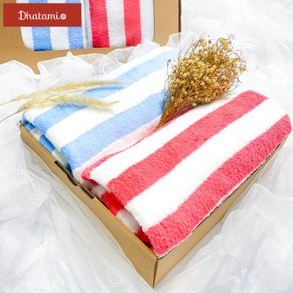 Hampers terdiri dari : - Box Packaging di design cantik - 2pc Handuk (Uk. 70x140cm) - Free Kartu Ucapan (bisa request teks ucapan) - Free 1 Lapis Bubble Wrap agar hadiah dari kamu aman sampai ditujuan (Untuk pengiriman yang lebih aman disarankan menggunakan Tambahan Bubble Wrap)