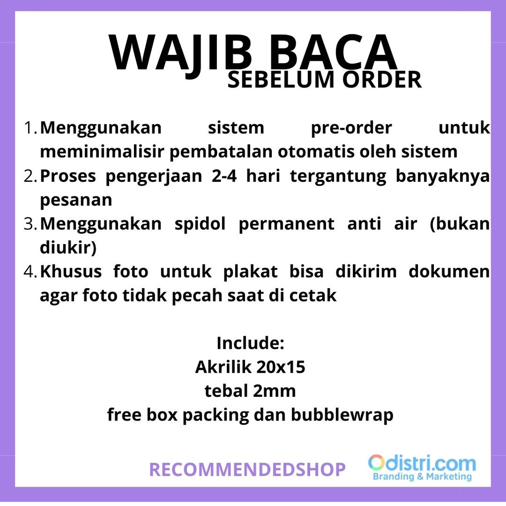 * Menggunakan sistem pre-order untuk meminimalisir pembatalan otomatis oleh sistem * Proses pengerjaan 2-4 hari tergantung banyaknya pesanan * Menggunakan spidol permanent anti air (bukan diukir) * Silakan tuliskan desain urutan kata-katanya pada chat atau bisa ditulis dikertas lalu di foto untuk dikirim ke admin * Khusus foto untuk plakat bisa dikirim dokumen agar foto tidak pecah saat di cetak