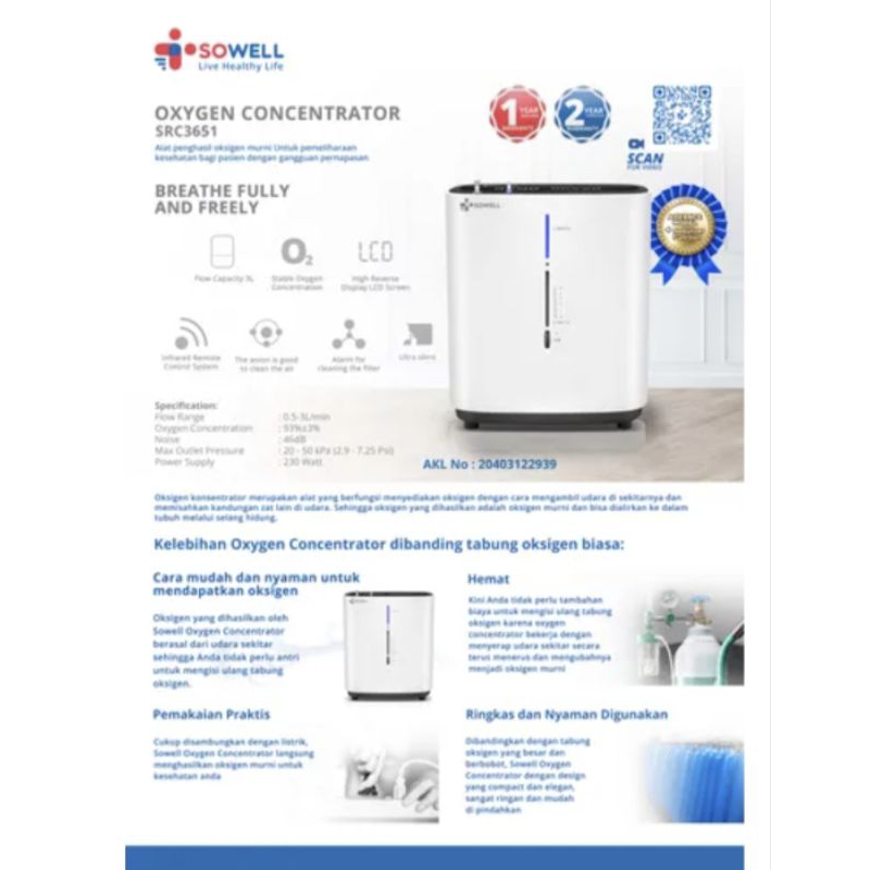 AKL 20403122939 (Izin Edar Produk Alat Kesehatan) Dimensi produk : 9.4 x 31.5 x 38 cm Rentang aliran : 0.5-3L / menit Oxygen Concentration: 93%±3% Maximum Outlet Pressure: 20~ 50kPa Sound Level: ≤46 dB (A) Daya input rata-rata : 230 volt Waktu pengoperasian minimum: 30 menit Penggunaan mudah dan praktis Garansi : 1 tahun garansi mesin 2 tahun garansi kompresor Syarat dan ketentuan pembelian : Maksimal pembelian 1 unit untuk 1 user/hari Untuk pembelian lebih dari 1 unit harap menghubungi customer service di 021-2967 0706 Warranty Part: 12 Months Warranty Service: 12 Months Warna: Putih Dimensi Kemasan: 40.0 x 32.0 x 48.0 cm Berat: 11 kg SKU: 10441317 Nama Komoditas: OXYGEN CONCENTRATOR 3LPM 230WATT SRC3651