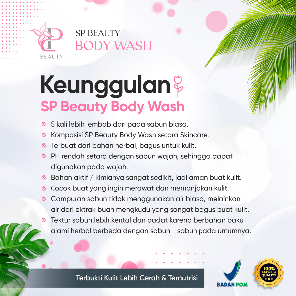 Ke uanggulan SP BEAUTY BODY WASH 🧡5kali lebih lembab dari pada sabun lainnya. 🧡terbuat dari bahan herbal bagus buat kulit. 🧡 PH rendah setara dengan sabun wajah 🧡 Bagus buat wajah juga. 🧡 bahan aktifnya / kimia nya sangat dikit. Jadi baik buat kulit 🧡cocok buat yg ingin merawat dan memanjakan kulit 🧡Campuran sabun tidak menggunakan air biasa. Melainkan Air dari perasan buah mengkudu yg sangat bagus buat kulit 🧡Tektur sabun lebih kental dan padat karna berbahan baku alami herbal .berbeda dengan sabun² Pada Umumnya