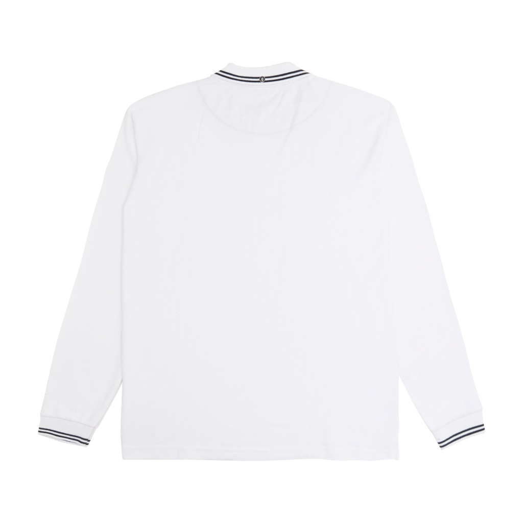 White cotton long sleeves polo shirt with transparent plastic buttons and embroidery patch.