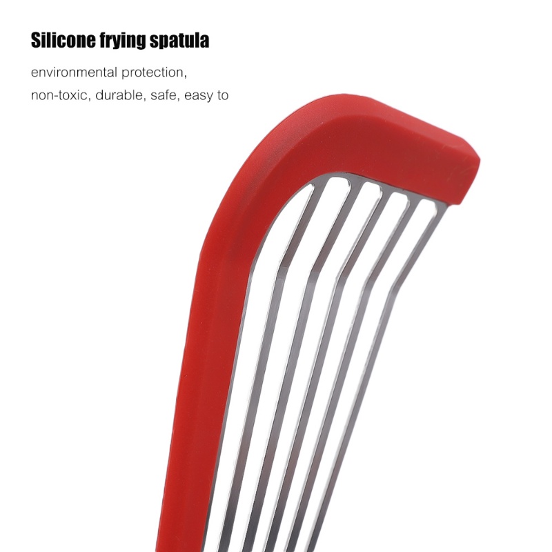 Deskripsi Produk: Nama Produk: spatula penggorengan silikon Bahan: baja tahan karat + silikon Warna: merah, abu-abu, hitam Ukuran: 28.5*8 cm Fitur Produk: perlindungan lingkungan, tidak beracun, tahan lama, aman, mudah dibersihkan Jumlah: 1 Paket berisi: 1 * spatula penggorengan silikon
