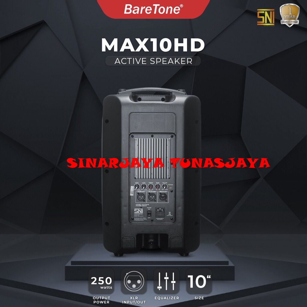 BARETONE AUDIO ACTIVE SPEAKER 10 INCH MAX10HD Spesifikasi : - Type: MAX10HD (Active) - Speaker Box Size: 10"2 way Pro Audio - Woofer Magnet: 40 oz - Voice Coil: 1.5" KSV - Frequency Response: 50Hz 20KHz - Sensitivity: 95dB (+/-3dB) - Impedance: 8 ohm - Tweeter: 25mm.Drivver - Amplifier: YES - Voltage: AC100-240OV - Power: 250W - Input: XLR - With Speakon: NO - Dimension: 39.5 x 37 x 59.5 cm - Gross/Net Weight: 9 kgs/8 kgs