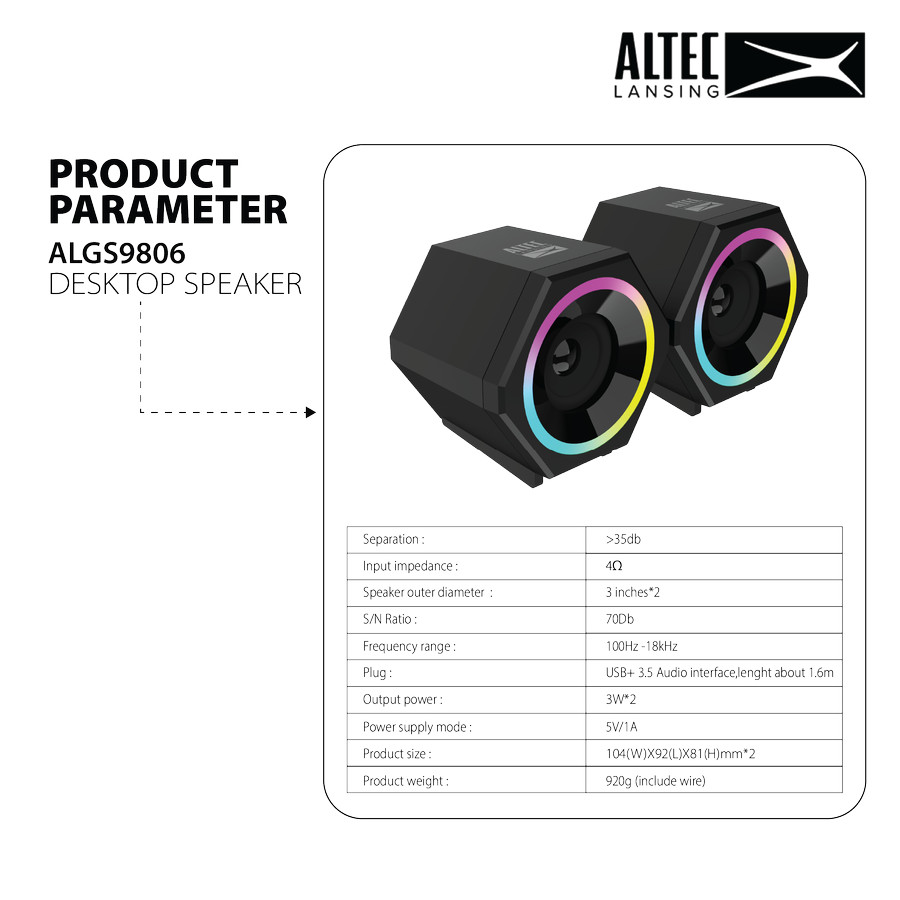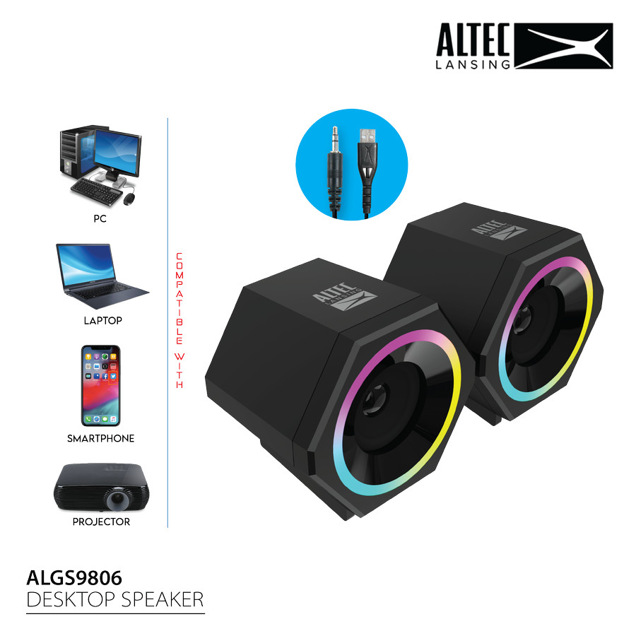 Altec Lansing Speaker RGB ALGS9806 memberikan suara lembut dan jernih. cakupan suara luas yang membuat kamu merasa puas saat mendengarkan lagu, bermain game dan lain sebagainya.