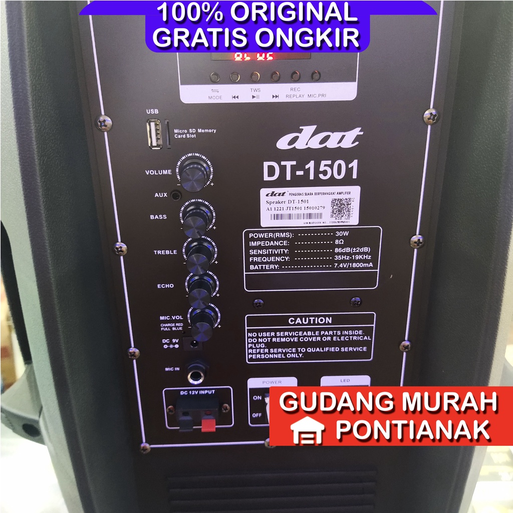 Detail Speaker Bluethoot DAT 15" Bonus 2 Mic Wireless ukuran 15inch Troly DT 1501
