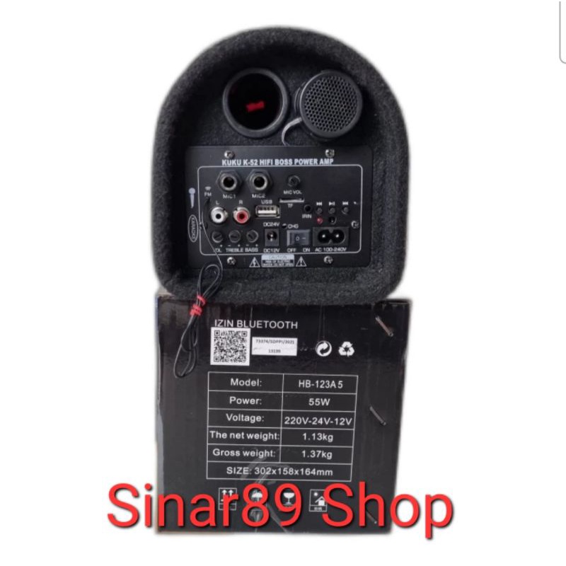 Spesifikasi : - Woofer : 5 inch + Twitter - Power : 55W - Voltage : 220V 50Hz - DC : 12V/24V - Bluetooth - Slot USB - Slot Micro SD - FM Radio - 2 Slot Mic Input - Remote Control - Aux Input - Dimensi : 30x16x17 cm - Berat : 1500 gram