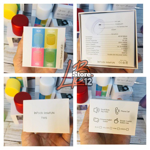 Speaker Bluetooth 5.0 TWS Portable Mini Bass Speaker Wireless Stereo Inpods LittleFun Macaron speker kecil dengan warna, warna warni yg lucu suara jernih boss ya Fitur: * Kecil dan Portable, speaker yang ringan bisa dibawa kemana saja * Menggunakan Bluetooth Chip Versi 5.0, transmisi lebih ceopat dan stabil, mendengarkan musik tanpa tersendat ataupun delay * Mendukung interkoneksi TWS dual-machine, satu perangkat dapat disambungkat pada 2 speaker bluetooth * Ini memberikan daya penuh bass suara & vokal penuh bertubuh meningkatkan pengalaman mendengarkan Anda. * Kapasitas Baterai 400mAh, dengan daya penuh dapat memutar lagu selama 2-3 jam non-stop * FIT PANGGILAN NIRKABEL ANDA, VIA BLUETOOTH! Dengan mikrofon built-in, Anda bisa menjawab panggilan Anda langsung dari Speaker Mini.