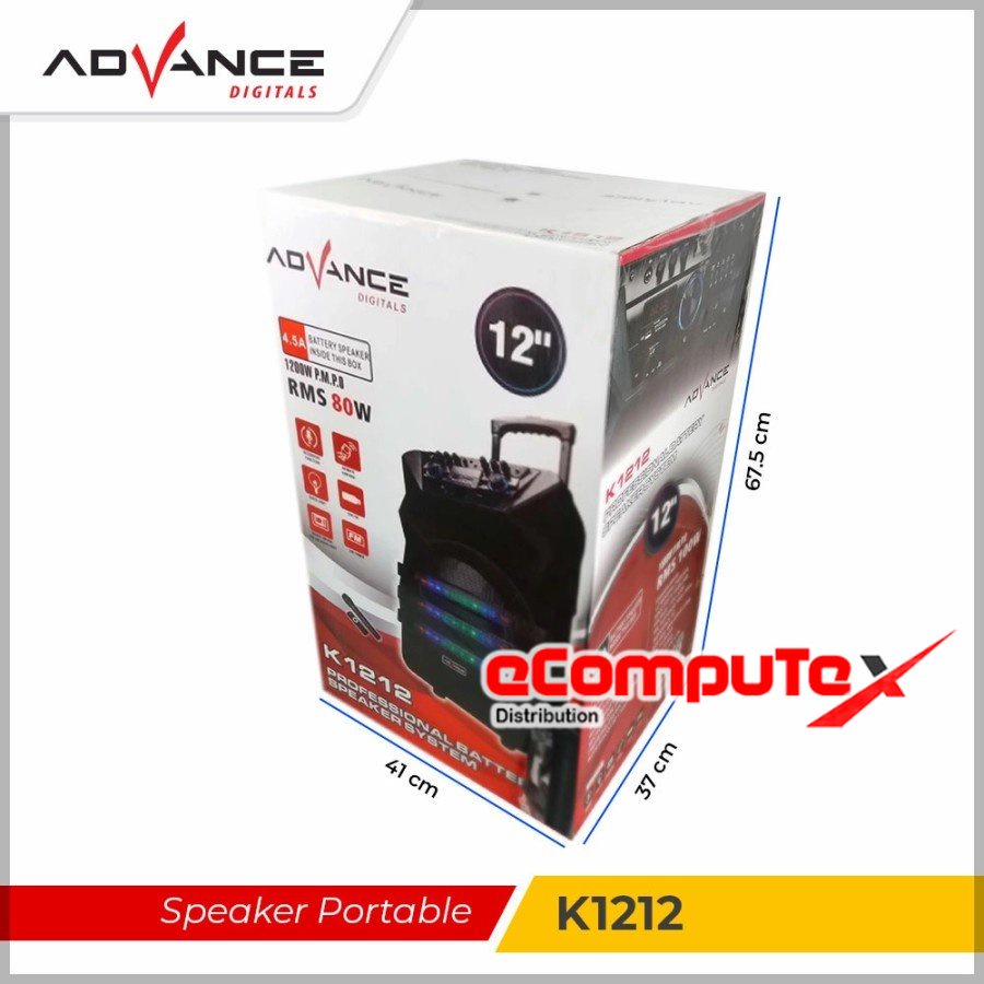 Speaker Portable 12 inch ADVANCE K-1212 Bluetooth *Profesional speaker system* √ 4.5A BATTERY SPEAKER INSIDE THIS BOX √ 1200 W P.M.P.O √ Bisa Bluetooth, √ Bisa FM radio, √ Bisa SD card, dan USB √ Flashdisk/Usb √ recording, √ FREE wireless microphone, √ Ada Colokan untuk Guitar in, √ Ada remote control. √ Speaker 12" woofer + tweeter, √ RMS 80w √ Volt 110v-220v √ Size 410x370x675mm.