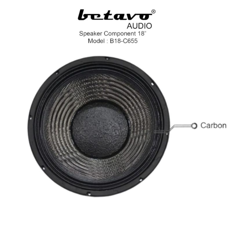betavo AUDIO Speaker Component 18" Model : B18-C655 Carbon WATT SMOd 3000 MPEDANCE. Triple Magnet Specification Power RMS Maximal Power Nominal Diameter Rated Impedance Sensitivity (1w/1m) Frequency Range Voice Coil Diameter Magnet Diameter Resonance Frequency Total Factor Effective Moving Mass Equivalent Cas air load Triple Magnet Nett Weight Gross Weight Packing Size 3000 WATT 6000 WATT 460 MM 8 OHM 97dB 40-1000 HZ 152 MM 300 MM 42 HZ Fs Qts0.3 Mms 416 GR Vas 55 Liters 54 16 KG 65.24 KG 60*60+35 CM