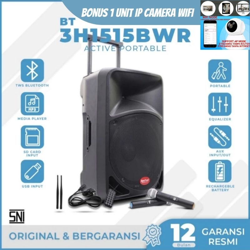 BARETONE SPEAKER PORTABLE 15 INCH BT-3H1515BWR - TWS BLUETOOTH *BONUS 1 UNIT IP CAMERA WIFI SPESIFIKASI :