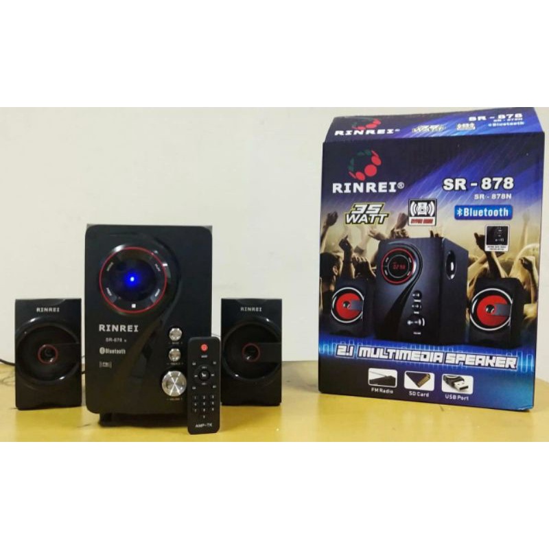 Spesifikasi : Bluetooth USB SD Card FM Radio Remote Control RMS 35W Cocok untuk Smartphone/BB/PC Suara Jernih Bass Bulat mega bass Garansi Resmi 1 Tahun Aktif RINREI SR 878 N Audio Multimedia 2.1 Super Woofer MEGA BASS Bluetooth