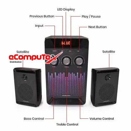 Spesifikasi : RMS : 36 Watt Driver : 4” + 3”x2 Power Input : AC 220 V / 50 Hz Impedance : 4Ω bass / 2 x 3Ω satellite Function : USB / LED Display / FM Radio / SD CARD / Bluetooth Frequency Response : 50 Hz - 20 kHz S/N Ratio : 70 dB Cabinet Material : Wood + Plastic ABS Color : Black