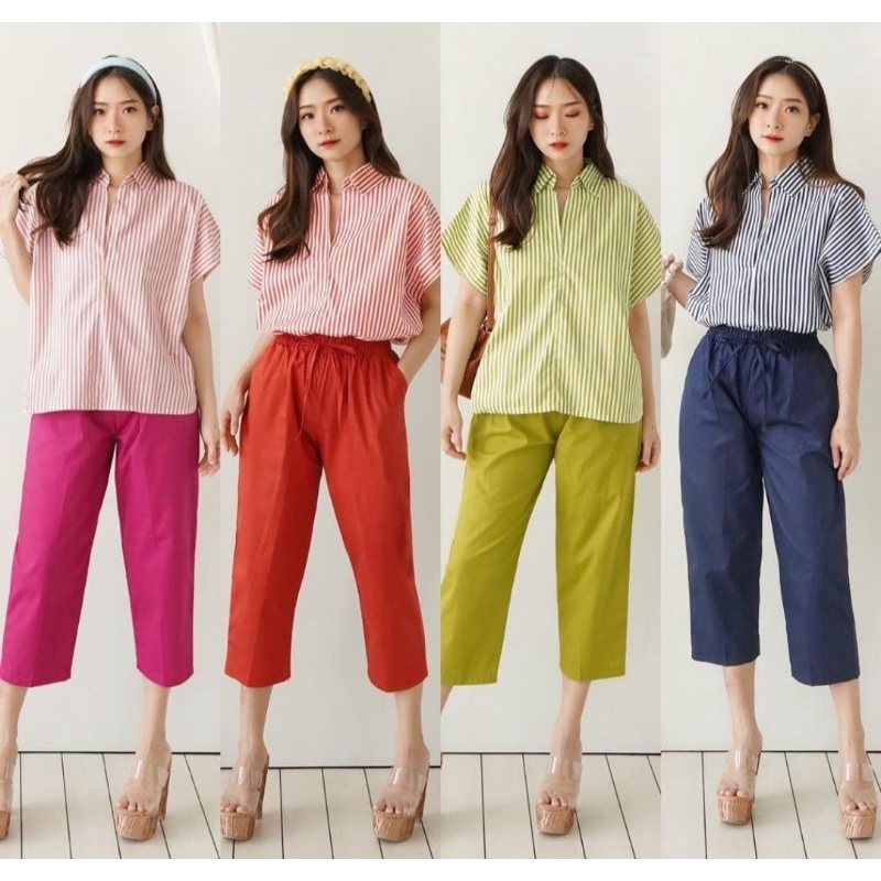 Detail ❣ SPECIAL PRICE ♡ PREMIUM ♡ REAL PIC! JOANNE STRIPEY PLAID 2IN1 COMFY SET BLOUSE + PANTS / SETELAN KEMEJA SALUR & CELANA POLOS SELUTUT