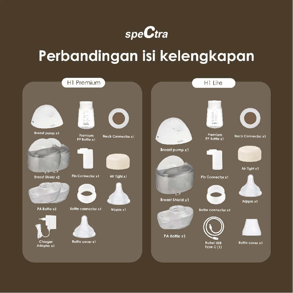 Memiliki 5 level mode pijat untuk menstimulasi LDR, memiliki 3 mode hisap dengan 5 level kekuatan hisap yang dapat disesuaikan dengan kenyamanan penggunanya. Semua bagian pada Spectra H1 Wearable Breastpump dapat dilepas sehingga mudah dibersihkan dan disterilisasi, terbuat dari plastik BPA Free dan memiliki sertifikasi KEMENKES RI.