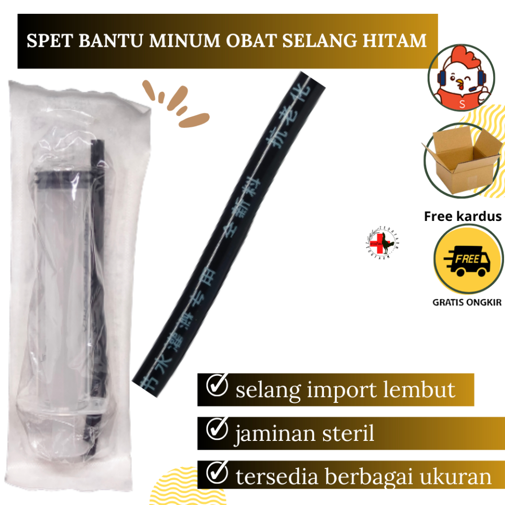 spet steril plus selang hitam import berkualitas selang mudah di pasang tidak mudah lepas tidak keras untuk mambantu melontarkan obat cair dan memberi makanan lolohan pada herwan