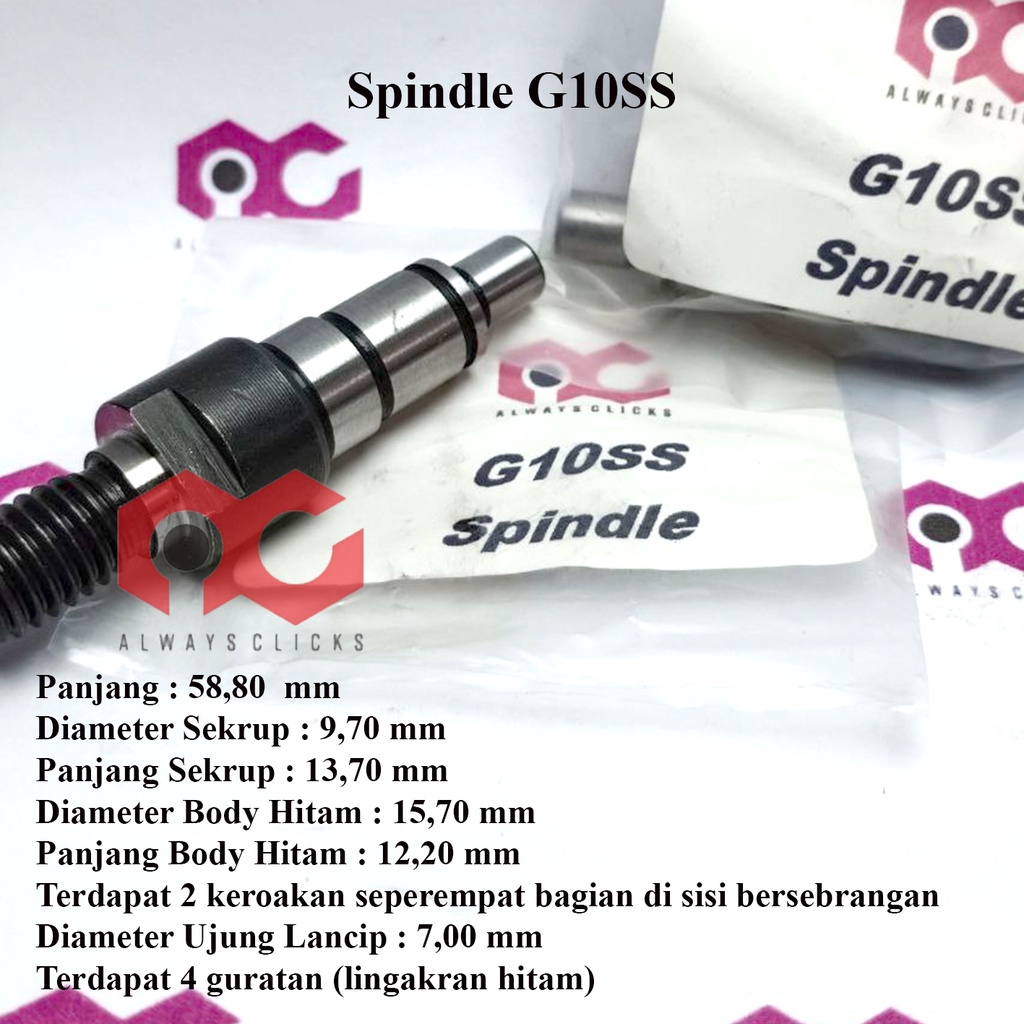 SPINDLE AS BOR PH65A GERINDA G10SS Panjang : 58,80 mm Diameter Sekrup : 9,70 mm Panjang Sekrup : 13,70 mm Diameter Body Hitam : 15,70 mm Panjang Body Hitam : 12,20 mm Terdapat 2 keroakan seperempat bagian di sisi bersebrangan Diameter Ujung Lancip : 7,00 mm Terdapat 4 guratan (lingakran hitam)