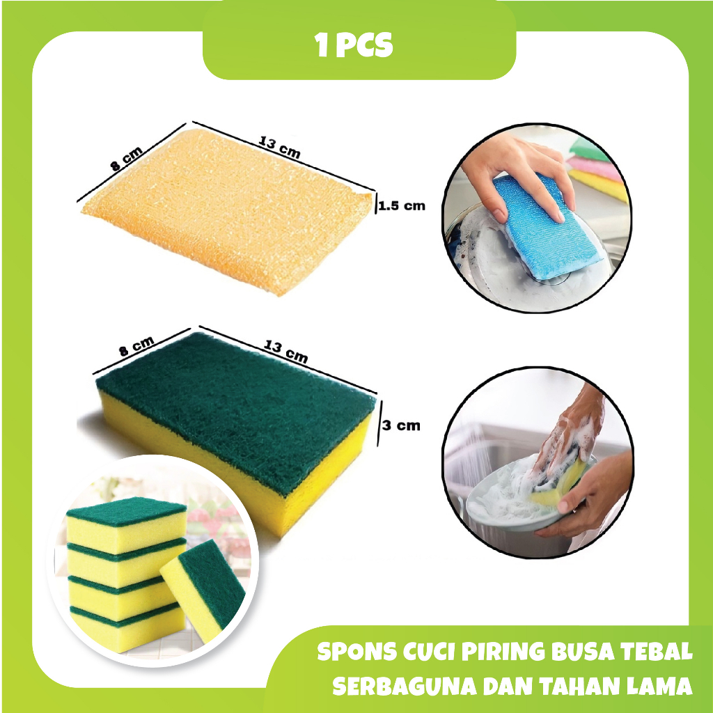 Keunggulan: - Busanya tebal (3 cm) - Terdapat 2 permukaan yang berbeda (kasar dan lembut) - Terdapat sabut hijau untuk mengikis noda membandel - Terdapat spons kuning lembut untuk membersihkan secara halus - Ukurannya nyaman digenggam (pas di telapak tangan)