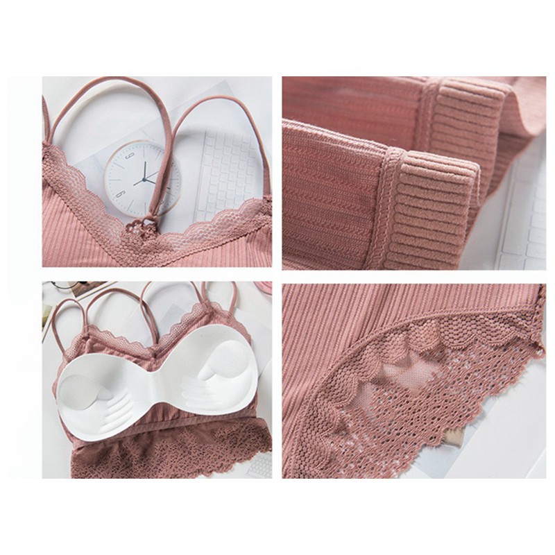 &. Set Bra adalah bra yang terbuat dari Bahan katun dan Lace yang Sangat nyaman Untuk di pakai pada saat berolahraga,yoga ataupun di pakai sehari-hari bra yang memiliki kelenturan bahan yang sangat lembut tidak memyebabkan iritasi pada kulit dan tdak menyebabkan sesak. &. Kainnya lembut, Ramah kulit dan bernapas, Pad desain dada dilepas secara bebas, lebih banyak kebebasan dan kenyamanan. &. Ada banyak pilihan warna yang berbeda, cocok untuk dikenakan dengan berbagai pakaian.