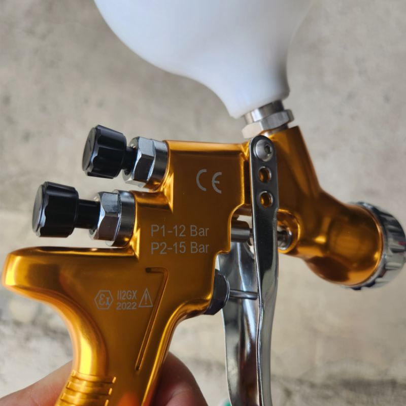 High quality professional spray gun Devilbiss HD-2 GTI almighty environmental protection top coat spray gun 1. Nozzle 1.3 mm 2. Apply paints and varnishes. 3. classic comfortable handle, showing incredible handling and balance; 4. Innovative trigger design, handle smoothly and comfortably, very easy to clean and maintain. 5. The forged and pressed pistol body is compact to prevent paint from jumping. 6. Extremely delicate mirror surface treatment, the gun looks like a fine work of art. 1. Nozzle Size: 1.3mm 2. Nozzle Material: Highest quality level of stainless steel. 3. Cup: 600 ml 4. Rekomendasi Working Pressure: 2.0 - 3.0 bar; Max pressure: 10 bar 5. Rekomendasi Jarak Semprotan 15cm-25cm 5. Lebar Semprotan: 25 cm 6. Air consumption: 8-8.5 cfm 7. jumlah cat yg dikeluarkan : 200-240ml/ min