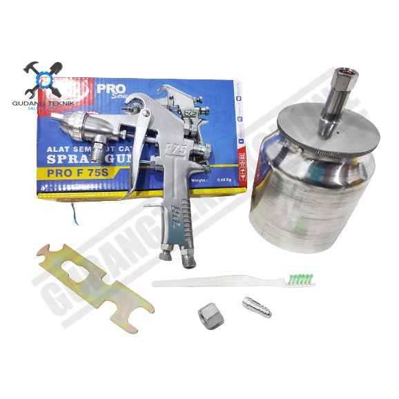 Spesifikasi F75S TABUNG ATAS : standard nozzle : 1.5mm optimal nozzle : 1.3-20mm operating pressure 3.0 - 4.0 bar / 2.5~4.5 kgf/cm2 pattern width : 150 - 180 mm (lebar sebaran) spraying distance 20cm-25cm (jarak pengecatan) air consumption : 4.6 - 7 kfm paint capacity : 400cc type of feed : gravity(tabung atas