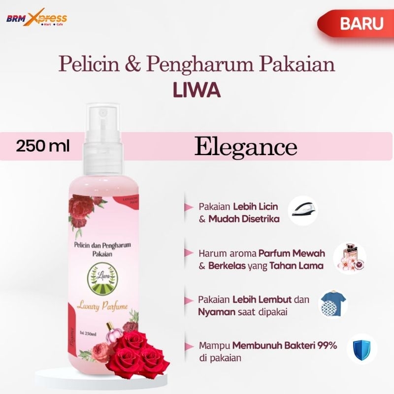 Mengandung Formula yang efektif membunuh 99% kuman penyebab bau apek pada pakaian. Dibuat dengan komposisi kualitas terbaik Bibit Parfum Mewah berkualitas terbaik. Dikemas dengan Botol Spray 250 ml (Travel Size) yang membuat Pelicin & Pengharum Pakaian LIWA mudah dibawa kemanapun dan Kapanpun.