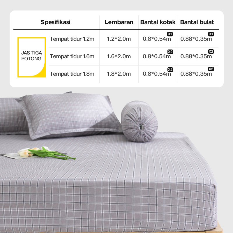 Ukuran : 120x200cm = 1Pcs Sarung Bantal, 1Pcs Sarung Guling Ukuran : 160x200cm = 2Pcs Sarung Bantal, 2Pcs Sarung Guling Ukuran : 180x200cm = 2Pcs Sarung Bantal, 2Pcs Sarung Guling