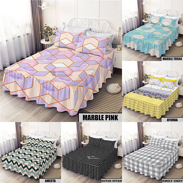 Terdapat 2 jenis barang: 1.Sprei Rumbai Sprei yg setiap sudut nya terdapat karet agar tidak mudah lepas bilamana dipasang dan memiliki rumbai/rempel pada bagian tinggi sprei nya yg bisa mempercantik atau menutupi kolong risbang kasur. Sprei ini sudah dilengkapi dengan sarung bantal & guling sbg berikut: * 160x200 = 2 Sarung Bantal 2 Sarung Guling * 180x200 = 2 Sarung Bantal 2 Sarung Guling