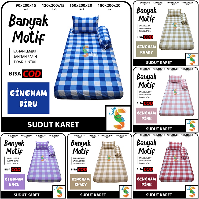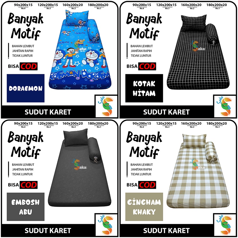 Sprei Sudut karet ------------------------------ Pilihan : - lebar : 90 cm & 120 cm - Panjang : 200 cm - Tinggi : 15 cm