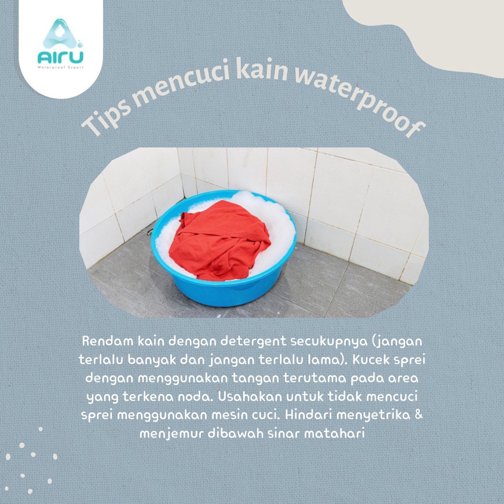 Bagi Anda yang sudah pernah membeli AIRU sprei waterproof atau berkeinginan membeli lebih dari 1 pcs, perlu diketahui bahwa bahan yang kami gunakan ini bukan berasal dari 1 pabrik/bukan 1 seri bahan dengan karakter yang sama percis. Bisa dipastikan bahan yang Anda beli kali ini berbeda (entah itu dalam perspektif Anda lebih atau lebih buruk). Namun yang perlu di tekankan adalah bahan yang kami gunakan sama-sama waterproof, dengan coating lateks di belakang, dan performa awal saat di tetesi air, air tidak menyerap ke bahan (seperti air yang jatuh di daun talas).