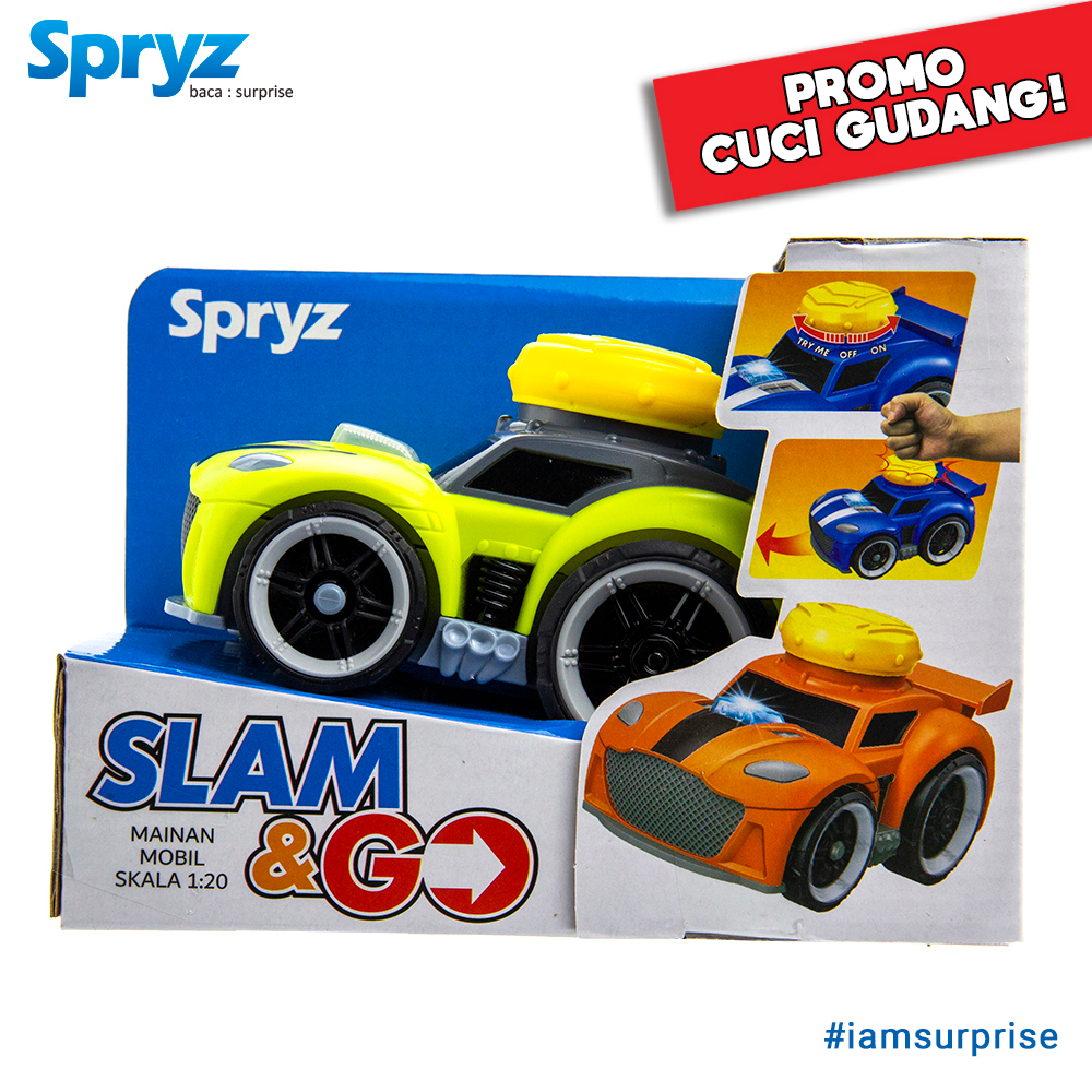 Spryz Slam & Go adalah mainan mobil yang keren dengan mekanisme yang seru. Mobil akan melaju kencang ke depan jika ditekan tombol kuning di atasnya. Terdapat 3 pilihan warna yang keren, yaitu : Orange, Hijau dan Biru.