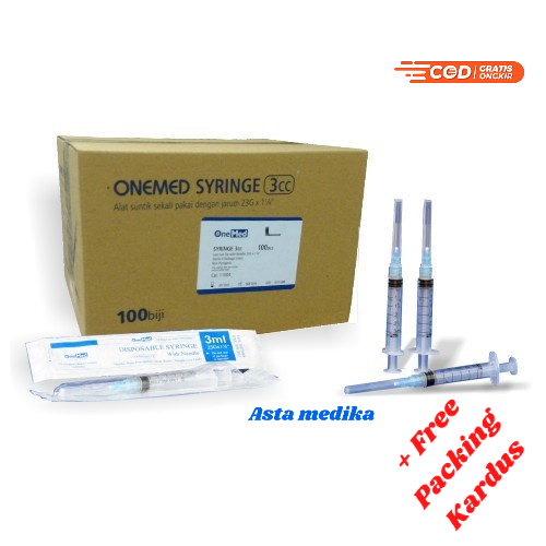 Merk : Onemed Ukuran : 3CC Needle : 23G x 1 1/4" Harga : 1 box (100pcs) Bahan : PP medical grade, gasket non latex Sterilisasi : Ethylene Oxide Gas Kemasan : Blister packing satuan, Dus isi 100 pcs Kegunaan : Untuk memasukkan cairan obat pada pasien
